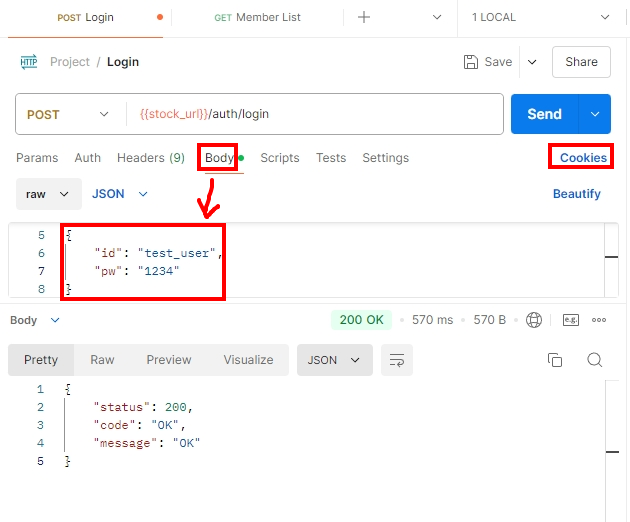 Body에 적절한 body값(ID, PW)을 입력하고 Send해서 OK를 리턴받은 후, Cookie를 확인해보자.
