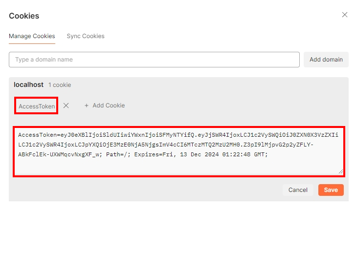 Cookie에 TOKEN_COOKIENAME (프로퍼티에 저장된 값으로는 " AccessToken ") 라는 이름으로 토큰을 넣어준다.