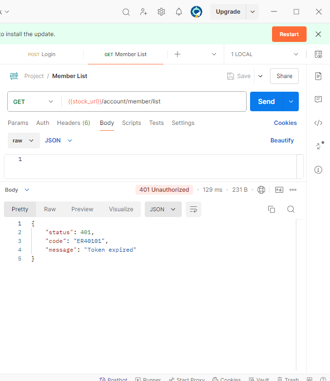 Cookie가 없는 상태로 API를 호출했을때, 토큰이 없다는 오류를 정상적으로 리턴하는것이 확인된다.