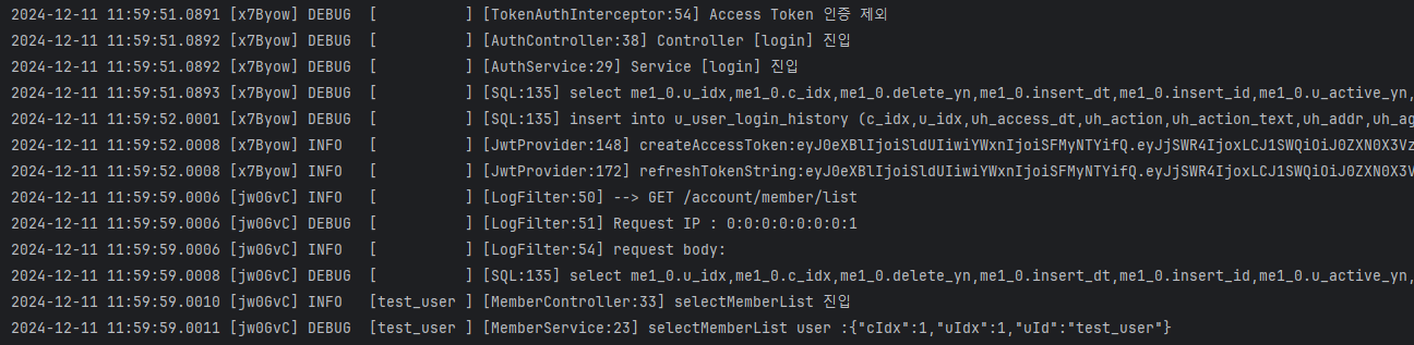 API가 호출될때에도 요청 URI, Method, request body, IP등을 출력해서 확인이 가능하도록 했다.